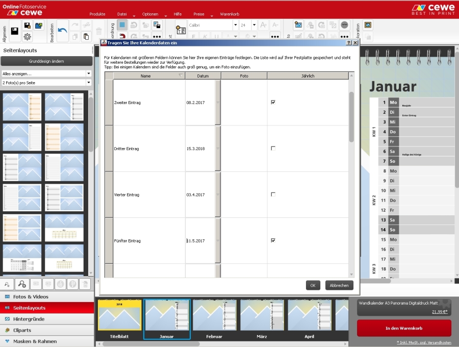 Kalenderdaten ändern und neu abspeichern, dann müsste doch das alte Projekt (+ eigener Kalenderdaten) überschrieben werden. Oder unter einem neuen Namen abspeichern.Lassen sich die bisherigen – auf dem PC gespeicherten - eigenen Kalendereinträge löschen, so dass der Versuch unternommen werden kann, die eigenen Kalendereinträge neu - und dann hoffentlich fehlerfrei - zu erstellen? Viele Grüße Re: Probleme bei eigenen KalendereinträgenHallo PeFoto,
