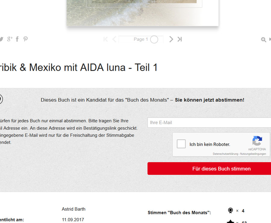 Re: Fotobuchwettbewerb MonatssiegerInzwischen kann man wohl für jedes Buch abstimmen. Gestern hatte ich lediglich die ungewöhnliche Auswahl zwischen Aida, Lanzarote und Thailand/Kambodscha. Da hatte ich mich doch über die Auswahl gewundert - aber zumindest waren alle sehr unterschiedlich. Jetzt würde mich aber doch noch interessieren, ob tatsächlich das Buch mit den meisten Stimmen Monatssieger wird oder ob die letzte Entscheidung doch Cewe obliegt?