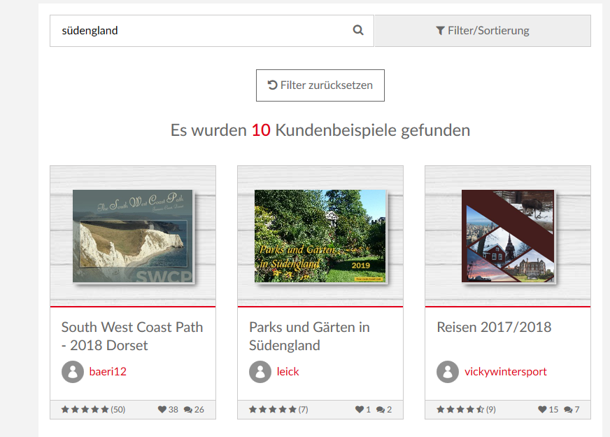 Mein Weg zum Aufruf der Seite war folgender: Internet-Explorer – Aufruf der Seite: https://www.cewe.de/cewe-fotobuch.html - runterscrollen bis Service – Cewe Community Dann öffnet sich dieser Link: https://www.cewe-community.com/global/? ... cale=de_DE Problem/Frage: Bis vor etwa 2 Wochen waren dann alle neuesten Fotobücher der Community sichtbar, das neueste zuerst und unabhängig vom Thema. Jetzt aber erscheint kein einziges Buch. Um überhaupt Inhalte ansehen zu können, muss ich einen Suchbegriff eingeben, z.B. „Südengland“. Mit fehlt jedoch die Gesamtansicht, so wie es früher war. Ich habe es mit Screenshots zur Verdeutlichung festgehalten. Wie kann ich wieder eine Gesamtansicht aller neu eingestellten Fotobücher erreichen? Habe das Problem bereits zweimal mit der Service-Hotline besprochen, die mir leider nicht helfen konnten. Für Eure Hilfe bin ich Euch jetzt schon dankbar. Ich habe auf dem PC Windows 10 und verwende den Microsoft Edge-Internetexplorer. Liebe Grüße Albine Liebe Grüße Albine