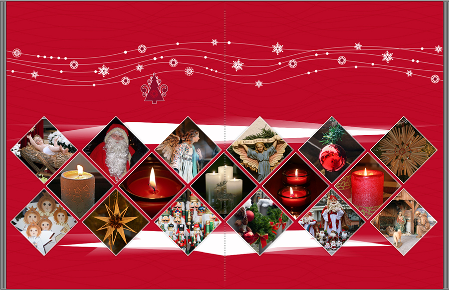 Re: 18. Dezember | Kategorie: SoftwareLege die Fotos in einer Größe von beispielsweise 7 cm direkt nebeneinander, die zweite und dritte Reihe passend ausrichten, dann alles markieren und unter Objekte positionieren - Objektgröße ändern - Absolute Größe einstellen auf z.B. 6,5 x 6,5 geändert und bei Eckenoptionen 100 einstellen.