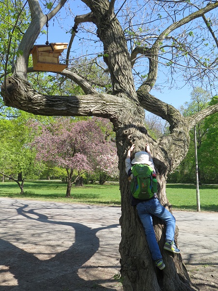 Wenn der kleine Mann Katze spielt, versucht am Baum hochzuklettern, um ins Vogelhäuschen zu schauen und schon nach 30 cm am Stamm hängen bleibt wie ein Sack Kartoffeln.