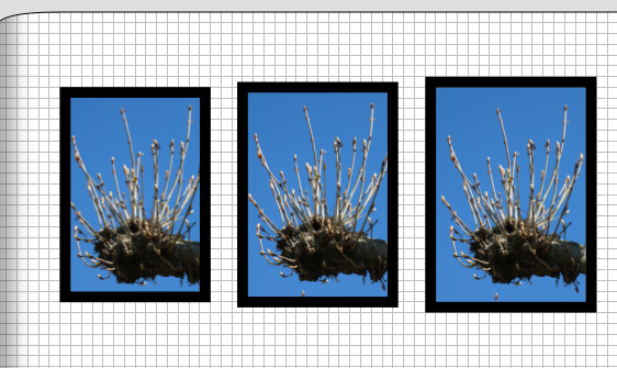 bei mir sieht es so aus, vergleichbar mit dem Beispiel von KlausA. Alle Bilder haben ohne Rahmen die gleiche Größe, ausgerichtet am 5 mm Netz.