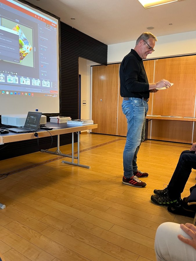 Gern hätte ich am Samstag um 10:00 Uhr einen Fotowalk mit den Beiden gemacht, hatte mich aber zu um 09:00 Uhr für den Fotobuch-Workshop mit Andreas Scholz entschieden. So konnte ich Andreas mal persönlich kennenlernen. Da nach dem Kreativkurs heftiger Regen einsetzte, haben wir uns mit einigen Teilnehmenden bei Kaffee ausgetauscht. Hier habe ich, wie auch bei von mir organisierten Kursen, festgestellt, dass die im Forum diskutierten Themen auf ziemlich hohem Niveau sind. Obwohl die Personen schon einige Fotobücher gestaltet hatten, waren ihnen einige einfache Gestaltungsmöglichkeiten nicht bekannt. So z.B. das Gruppieren oder das Malen in der Fotoschau und anschließendem Arbeiten mit Verläufen.