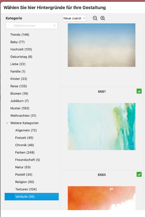 Hallo zusammen,der von Dir im Screenshot markierte Hintergrund trägt die Objektnr. 6661. Ich kann ihn im Downloadportal noch finden. Sinn macht es, vor erneutem Download den Papierkorb noch zu leeren, damit das alte Objekt auch vollständig gelöscht ist. Die seinerzeit gern als Hintergrund verwendeten Farbverläufe, welche nach kurzer Zeit wieder aus dem Angebot genommen wurden, waren Cliparts. da war ich wohl auf dem Holzweg, sorry! Ich habe die Clipart Farbverläufe wie von spica erwähnt als Hintergrund verwendet, deshalb meine Fehlvermutung! Spica ist einfach fit in diesen Dingen. Kurze Info: Ich konnte in meinem Testbuch den Hintergrund 6661 problemlos laden. Er erschient in der Kategorie Jahrbuch. Habe das Buch gespeichert und wieder geöffnet, der Hintergrund ist ohne Probleme und Hinweise erschienen. Getestet auf einem MAC mit der 7.4.3. Viele Grüße