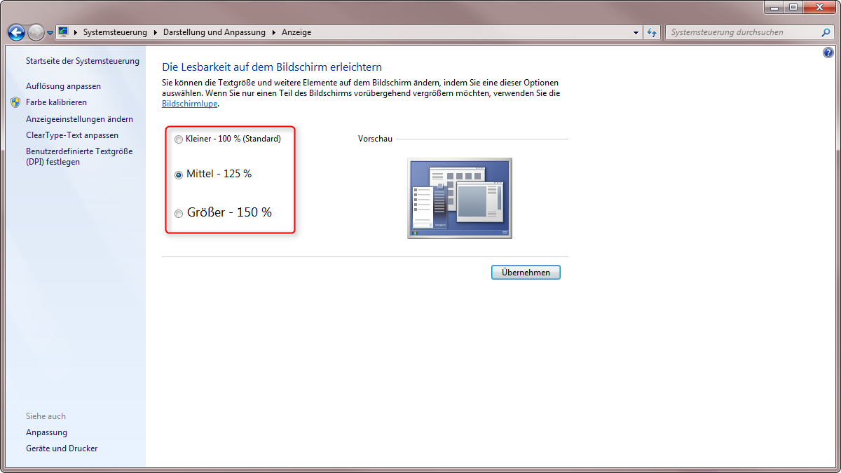 Ich möchte mich der Vermutung von Rotuma gerne anschließen. Unter Windows 7 finden Sie Möglichkeit die Lesbarkeit Ihres Bildschirms zu erleichtern. Dafür gehen Sie in Ihren Systemeinstellungen in den BereichDarstellung und Anpassung. Darin finden Sie die Option "Text und weitere Elemente vergrößern oder verkleinern". Liebe Grüße