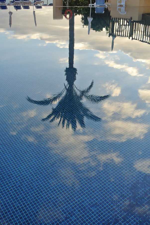 Silber-Distel Re: Challenge 10/2014 • SpiegelbilderDiese kopfstehende Palme ist von meinem letzten Sommerurlaub. Am Abend, nachdem niemand mehr im Pool war entstand diese Aufnahme.