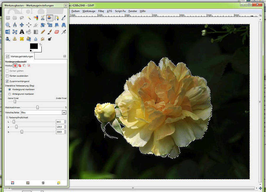 es gibt viele verschiedene Wege, Objekte freizustellen. Vielleicht ist der oben erklärte nicht so gut für Dein aktuelles Projekt geeignet, weil die Kontraste und Farbunterschiede viel geringer sind? Du könntest Dich. über die Anwendung von Masken in GIMP informieren, um mehr Möglichkeiten kennenzulernen, z.B. hier: http://gimp-werkstatt.de/ebenenmasken.php https://de.wikibooks.org/wiki/GIMP/_Tut ... reistellen Warum Du jetzt ein blasses statt eines freigestellten Objektes hast, kann ich nur vermuten. Kannst Du ein Bildschirmfoto machen? ['Druck'-Taste auf Deiner Tastatur drücken, GIMP öffnen, 'Datei - erstellen - aus Zwischenablage', mit Hilfe von 'Zuscheiden' aus dem Werkzeugkasten (Skalpell-Symbol) einen Bereich auswählen und 'Enter' drücken und ggf. die Größe anpassen = skalieren (Bilder im Forum dürfen höchstens 900px groß sein), abspeichern und hochladen.] Möglicherweise sind irgendwelche Empfindlichkeiten, Schwellenwerte oder Toleranzen nicht optimal eingestellt. Die Regler dafür findest Du in der unteren Hälfte es Werkzeugkastens. Das ist Feinturing, das in jedem Programm anfällt. Möglich ist aber auch, dass Du die falsche Ebene bearbeitet hast, oder den falschen Ausschnitt (z.B. Invertieren vergessen), oder dass die Deckkraft einer Ebene nicht 100% ist ('Ebenen - Farbverläufe' im Fenster rechts von der Arbeitsfläche). Hast Du die Sichtbarkeit aller nicht benötigten Ebenen ausgeschaltet? GIMP ist sehr mächtig, es ist sehr einfach sich im Dschungel der Möglichkeiten zu verlaufen Liebe Grüße, nox