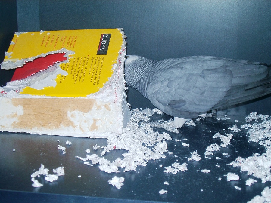 Unsere beiden Graupapageien beim Baden, auf mir sitzend auf's Futter wartend und als bekennender Hasser der damaligen Rechtschreibreform...