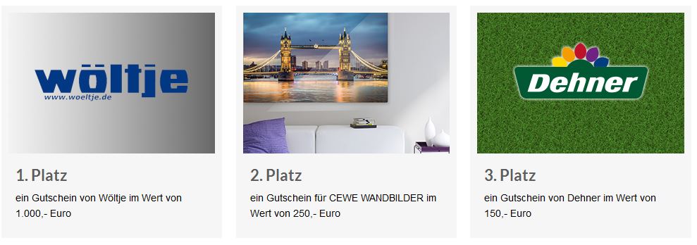 Als Hauptgewinn lockt ein Gutschein von Wöltje im Wert von 1.000,- Euro. Der zweite Preis ist ein Gutschein für CEWE WANDBILDER im Wert von 250,- Euro. Als dritten Preis vergeben wir einen Gutschein von Dehner im Wert von 150,- Euro. Die Plätze 4 bis 10 gewinnen jeweils einen Gutschein für ein CEWE FOTOBUCH im Wert von 50,- Euro.