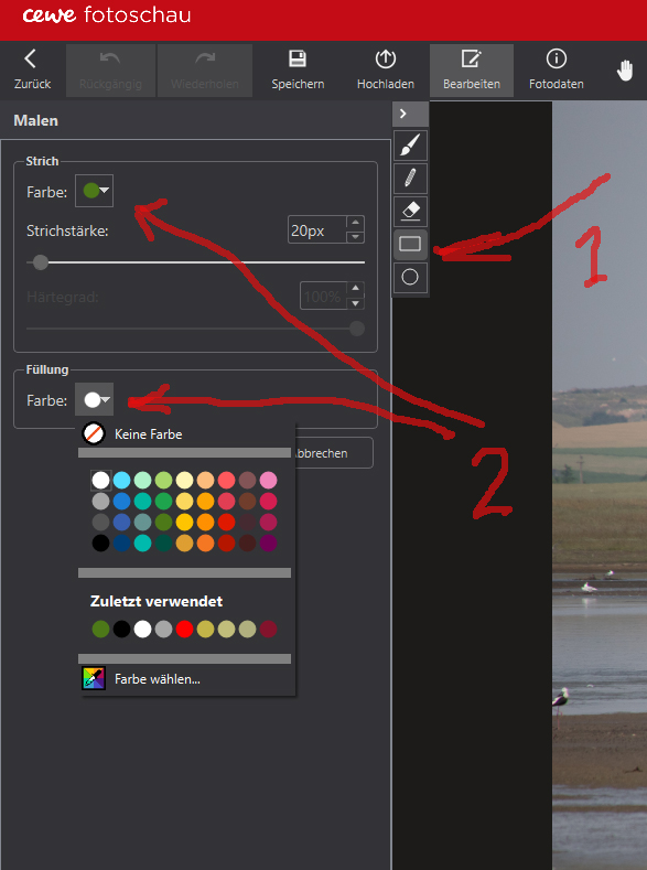 - In der Malen-Funktion nun das Rechteck wählen (1) und sowohl für "Strich" als auch für "Füllung" (2) die gewünschte Farbe einstellen und auf dem Foto ein Rechteck aufziehen, das das gesamte Foto in der gewünschten Farbe abdeckt.