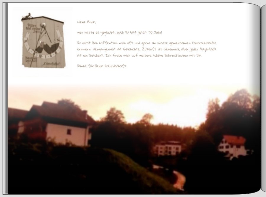 Vielen Dank, ich wusste ja auf Euch ist Verlass! vielleicht gefällt Dir die Aufteilung so? AsiafanRadLS.jpg Ich habe die Uhr etwas aufgehellt und in Sepia umgewandelt, sodass die Farbtöne der beiden Bilder besser harmonieren. Deine Schriftwahl ist nicht so meins, liegt aber sicher einfach an meinem Geschmack. Ich habe statt dessen irgendeine Handschrift gewählt, um den Zeilen eine persönliche Note zu geben. Falls sie Dir gefällt, es ist Gloria Hallelujah. Genau dies habe ich gesucht: Eine Handschrift, welche dem Text eine persönliche Note gibt. @Danke Spica, Dein Entwurf und die andere Anordnung gefällt mir gut. Du bist mal wieder meine Rettung. Ich war auch so darauf konzentriert, dass die Freistellung in die Mitte soll. Die Lösung war ja so einfach, man muss nur darauf kommen. "Umfärben". Ich habe mich allerdings für etwas mehr braun entschieden. Ich habe die Schriftfarbe noch angepasst und dem großen Foto mit einem Verlauf versehen. Jetzt bin ich zufrieden. Ich denke dies ist ein guter Abschluss des Fotobuches. Wir fahren am Samstag erst mal zusammen in den Schwarzwald. Ende der Woche wird bestellt. Dann dürfte das FB nach unserem Urlaub fertig sein. Liebe Grüße Asiafan