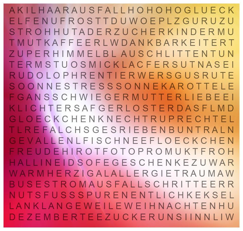 Sie können gerne mehrmals mitspielen und dabei neue Wörter entdecken. Schreiben Sie dazu bitte immer einen neuen Beitrag. Beachten Sie hierbei bitte, dass Sie nur auf einen Kommentar eines anderen Forenteilnehmers antworten dürfen, nicht aber auf Ihre eigenen Kommentare. Weisen Sie den gefundenen Wörtern bitte eine andere Formatierung zu, damit diese auf Anhieb für alle sichtbar sind.