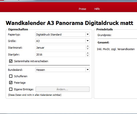 ich bin neu hier. Ich habe zwei Wandkalender A 3 Panorama Digitaldruck matt erstellt und bestellt. Version: 6.1.1 von real. Bei Einstellung habe ich für die Feiertage "Hessen" angegeben. Nach Absenden der Bestellung habe ich gesehen, daß im Kalender der 26.05. nicht als Feiertag im Kalender angezeigt wird, obwohl der 26.05. in Hessen ein Feiertag ist. Hätte man noch woanders etwas anklicken müssen, um die richtigen Feiertage im Kalender angezeigt zu bekommen? Schon mal besten Dank für Info. Viele Grüße. Re: Anzeige von FeiertagenHallo ilonam,