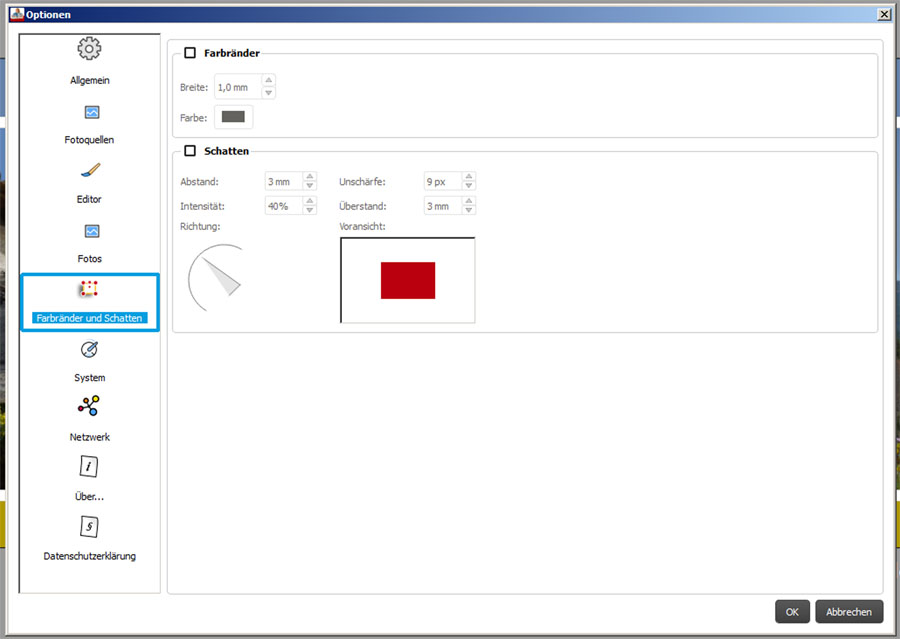 natürlich kann man diese Einstellung auch direkt unter "Farbränder und Schatten einstellen" ändern. Für die Bearbeitung ist das von Vorteil - du kannst deine Einstellungen auf die aktuelle Markierung, auf alle Elemente der Doppelseite oder alle Elemente im Produkt übertragen. Die Optionen kommen erst ins Spiel, wenn du in dem Dialogfenster "Farbränder und Schatten einstellen" deine Einstellungen speicherst. Du änderst dann sozusagen deine Grundeinstellung und diese finden sich alle gesammelt in den Optionen wieder. Auf deine persönliche Vorgehensweise hat das keinerlei Einfluss. Es gibt aber auch andere Nutzer, die vorab alles in den Optionen einstellen möchten. Die Optionen sind somit auch eine kleine Schaltzentrale Sylke Re: Rahmenfarbe und -stärke vorbelegenKlausA hat geschrieben: Hallo pitty,