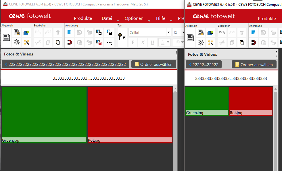 Versionsnummer: 6.3.4 Handelspartner: Online Service Beschreibung: Ich habe hier einen Fehler, der sporadisch, aber häufig, auftritt. Wenn ich die FB-Software starte, hat das Fenster des Auswahlbereichs (Fotos & Videos / Stile / Seitenlayouts etc.) eine bestimmte Breite. Wähle ich nun unter der Kategorie "Fotos & Videos" einen Ordner aus, dessen Name länger ist als in die Fensterbreite passt, wird das Fenster automatisch vergrößert. Hier die Originalbreite mit kurzem Ordnernamen: Hier nun wieder mit kurzem Ordnernamen (die große Fensterbreite bleibt bestehen): Hier das breite Fenster: Nur ein Neustarten der Software hilft aus dem Dilemma, bis wieder mal ein langer Ordnername aufgerufen wird - aber wie gesagt, nicht immer. Hat hier jemand eine Idee dazu? Gibt es vielleicht einen einfachen Workaround? Systembeschreibung: 64Bit Re: Größe des Fensters "Auswahlbereich" lässt sich nicht ändernHallo phili,