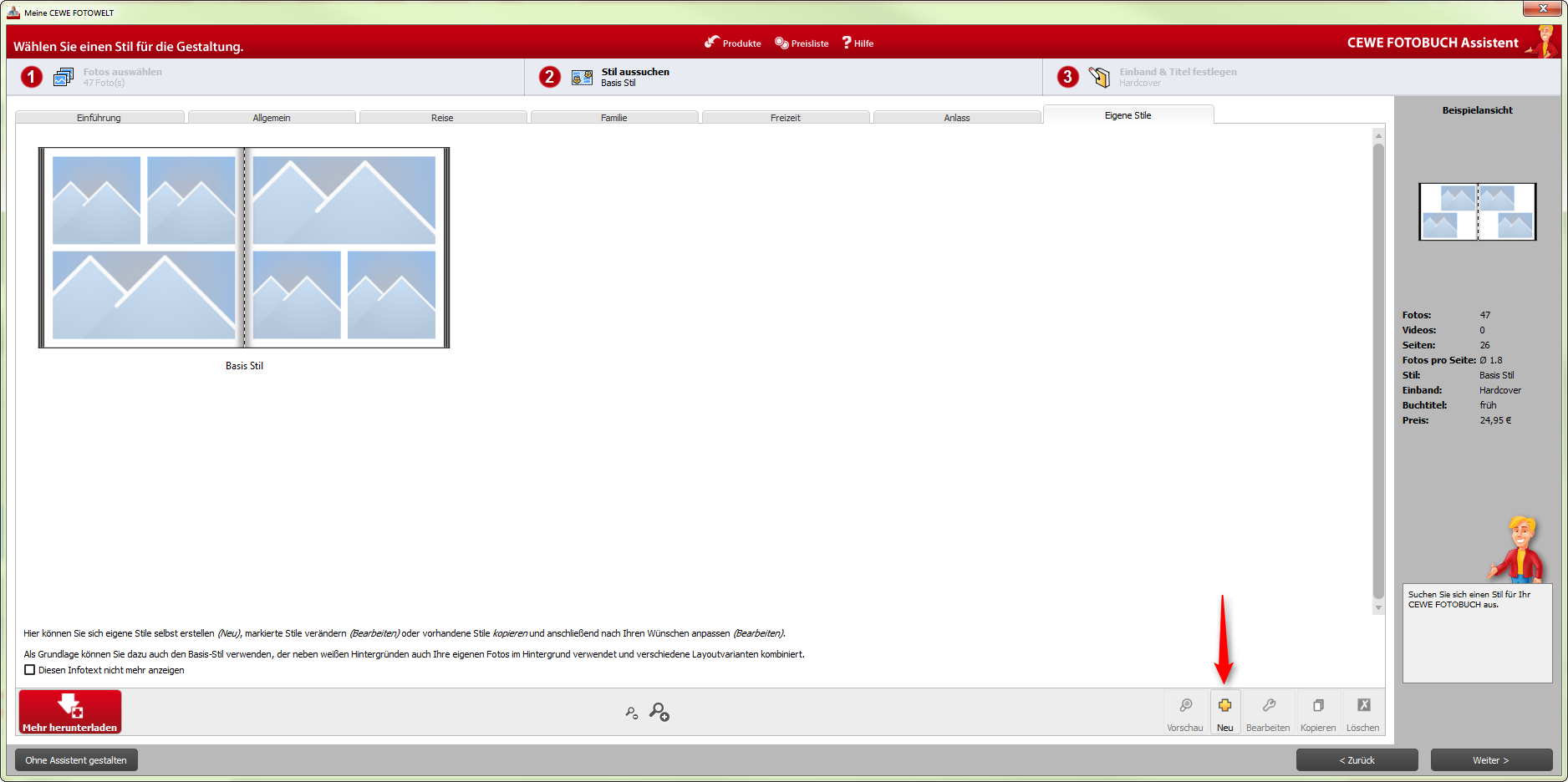 Nachdem ich mich durch alle Einstellungsmöglichkeiten für eine Vorlage nach meinen persönlichen Stilvorstellungen gezappt hatte, stellten sich mir eine Menge an Fragen. Warum ist es mir nicht gelungen, Layouts zu erstellen, wie ich sie hinsichtlich der Größen und Positionen der Bilder haben möchte. Warum konnte ich für die Hintergründe nicht genau die Farben auswählen, die mir vorschweben und so weiter, bis ich mich zuletzt gefragt habe, wie ich denn überhaupt für künftig zu erstellenden Bücher an meine Vorlagen komme, ohne dass ich jedes Mal mit dem Assistenten zusammenarbeiten muss.