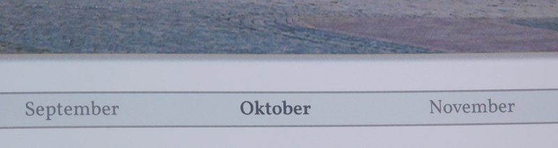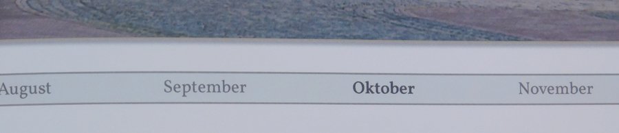 Bei den "ausgegrauten" Monaten habe ich den Alpha-Kanal-Wert auf 124 gesetzt. Das hielt ich bislang für ausreichend Hier mal eine Doppelseite aus meinem Jahrbuch Im fertigen Buch sieht es für mich dagegen so aus, als ob die Monate überhaupt nicht augegraut sind?? Zwar setzt sich auch hier der hervorgehobene Monat deutlich ab, aber ich habe gleichzeitig den Schriftschnitt von Vollkorn (Größe 12, Farbe dunkelgrau RGB-Wert jeweils 88, Alphakanalwert 124) auf Vollkorn Semibold (gleiche Größe und Farbe, Alphakanalwert 255) gewechselt und denke, dass vor allem die Änderung des Schriftschnittes (Vollkorn -> Vollkorn Semibold) die Hervorhebung des betreffenden Monats bewirkt Ich füge hier mal 2 Fotos an Ich könnte so ohne Schwierigkeiten einen ganzen Text lesen (und ich habe keine "Adleraugen") Ich bin mir nicht sicher, ob der Wert für den Alphakanal von 124 einfach noch viel zu hoch ist (ich versuche es jetzt mit dem Wert 80) oder ob hier schlicht ein Druckfehler vorliegt ... Mit welchen Werten arbeitet Ihr bei ähnlichen Layouts und welche Erfahrungen habt Ihr bezüglich des Druckes gemacht? Liebe Grüße