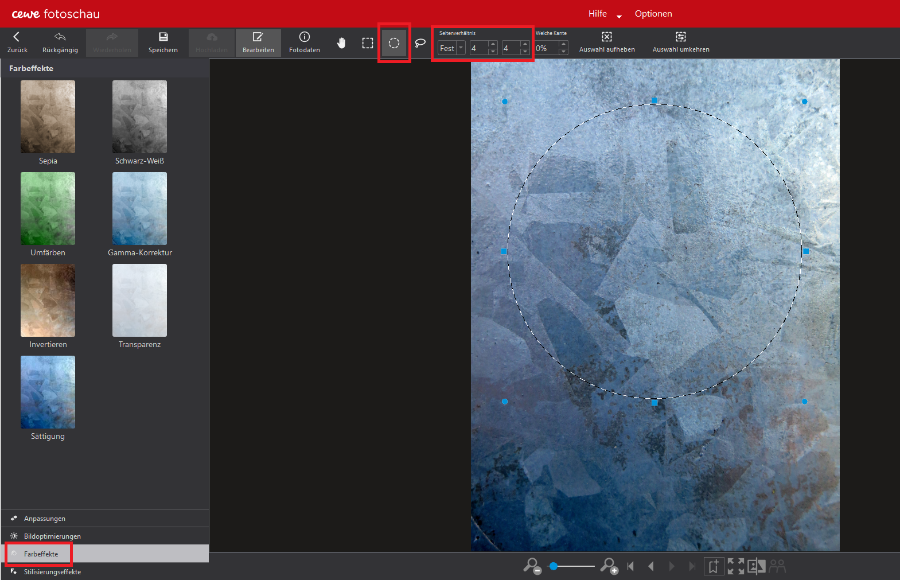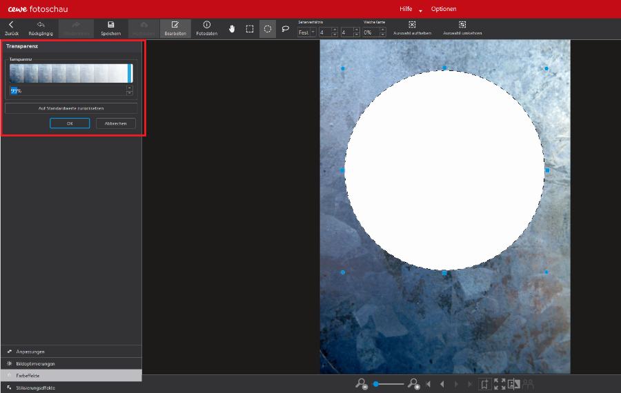 Dazu ziehe ich zunächst das gewünschte Foto ins Buch und öffne es anschließend in der CEWE Fotosschau - entweder per Doppelklick aufs Foto oder per Bearbeiten --> Fotobearbeitung starten. Dort wähle ich Farbeffekte aus und aktiviere den Kreis. Damit es auch ein exakter Kreis wird, müssen die Einstellungen wie gezeigt auf Fest und identischen Werten bei Höhe und Breite des Seitenverhältnisses stehen. Den Kreis ziehe ich auf, indem ich eine beliebige Stelle auf dem Foto markiere und den Cursor anschließend diagonal ziehe, bis der Kreis meine gewünschte Größe hat. Die Position des Kreises innerhalb des Fotos kann ich individuell verschieben. Dazu einfach in den Kreis klicken, sodass eine Cursormarkierung mit 4 Pfeilen in alle Richtungen erscheint und dann den Kreis an die Wunschposition bewegen. Anschließend wähle ich Transparenz und dort den Wert 99% aus, drücke OK und Speichern (Foto im Produkt ersetzen). Fertig! Hier zwei Beispiele. Einmal mit gemustertem Foto und einmal mit einem einfarbigen Bild. So lassen sich je nach Gestaltungswunsch ganz unterschiedliche Effekte erzielen. Einfarbige Bilder kann man dabei aus seinem persönlichen Fundus nutzen oder ebenfalls in der CEWE Fotoschau mit der Malen-Funktion erstellen. Mein Tipp zur Erstellung der Negativmaske: Den Kreis nicht zu groß, aber auch nicht zu klein aufziehen, wenn der Ausschnitt später fast seitenfüllend verwendet werden soll. Es sollte immer noch genügend Bild um den Ausschnitt vorhanden sein, damit der Kreisrand nicht direkt an den Seitenrändern im Buch sitzt. Der runde Bildausschnitt lässt sich auf der Buchseite jederzeit einfach vergrößern, indem man den Zoom benutzt. Liebe Grüße