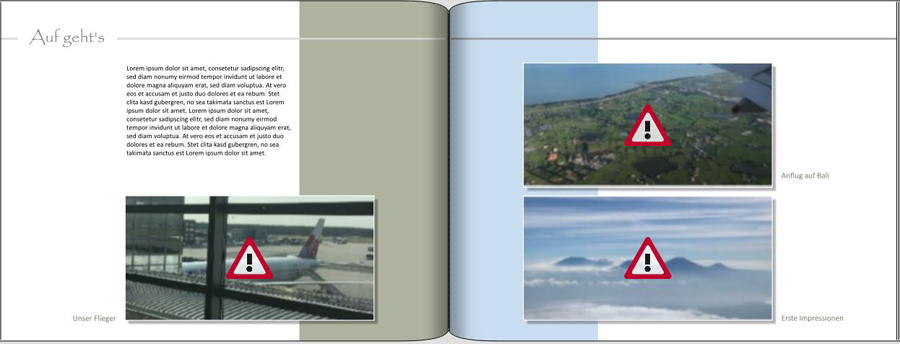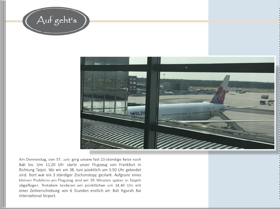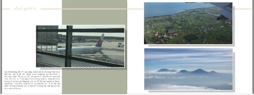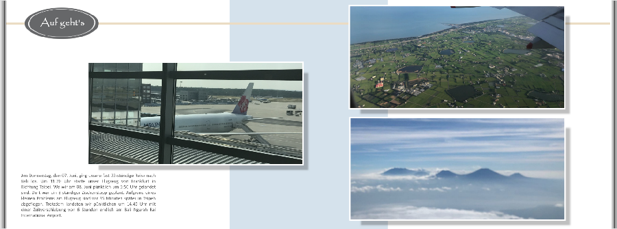 Hallo Gewitter, hatte es vorhin nur am Smartphone angeschaut. Jetzt sehe ich, dass es eine Doppelseite ist.das wäre die seite die nach dem "inhaltsverzeichnis" käme Hoffe ihr könnt es lesen sonst poste ich es gerne einzeln wir sind in frakfurt los geflogen (flugzeug bild) in taipeh war die zwischenlandung (rechte seite bild oben) und bali dann gelandet (bild war vom Landeanflug (sind die Vulkane von Bali) Mir mich klebt der Text zu sehr unten. Wie wäre es, wenn Du das Bild mit dem Flugzeug und das Clipart in der Breite schmäler ziehst. also zu 2/3 der Seite Das Textfeld auch schmäler etwa 1/3 und dafür höher. Entweder links anordnen oder zwischen den Foto`s. Jetzt kann man auch den Text besser lesen. Die Rechtschreibung wirst Du ja noch mal überprüfen - bei Zwischenstopp fehlt das w. Lg Asiafan Liebe Grüße Asiafan