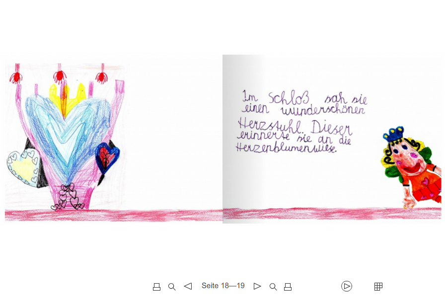Ein Beispiel, dass ich jedoch finden konnte, ist „Die Zauberkugel“ von Inge Stieb. Diese Gestaltung mag Ihnen vielleicht nicht auf den ersten Blick zusagen. Jedoch versteckt sich hinter der Gestaltung ein künstlerischer Gedanke, den Sie auf der vierten Seite umschreibt.