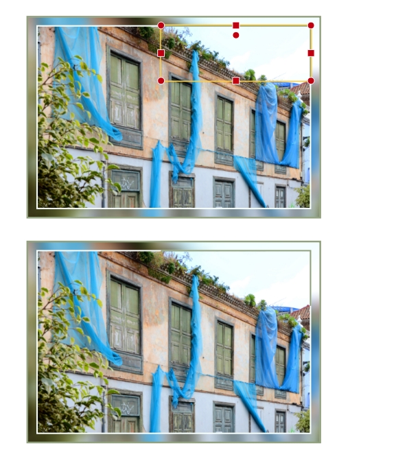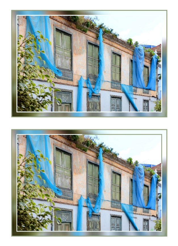 da habe ich euch wohl verwirrt Ich habe mich mit meinem Beispiel an Pascalinahs Cover orientiert - sie wird mich daher vermutlich verstanden haben. Es geht nicht um den unscharfen Rahmen, sondern um die Ecke mit dem grünen Farbrand am hellen Himmel. Nur mit dem weißen Farbrand "verschwimmen" Hintergrund und Vordergrund an dieser Stelle miteinander. Deshalb habe ich dort einen grünen Farbrand hinzugefügt. Hier der Vergleich mit und ohne grünen Farbrand: So gesehen braucht man für den weichgezeichneten Rahmen das Foto also noch ein viertes Mal. Sorry, es wäre sicher verständlicher gewesen, wenn ich dran gedacht hätte, das zu erwähnen Und nur der Vollständigkeit halber: Der dunklere Farbrand kann je nach Bild dezent oder kräftig besser aussehen. liebe Grüße