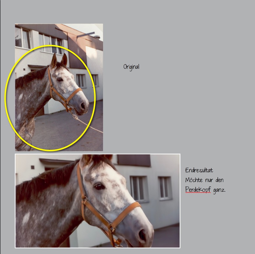 Re: Bild an Rahmengrösse anpassenDer Pferdekopf, so wie Du ihn möchtest, geht entweder mit einer runden (oder ovalen) Maske oder einfach (nahezu) quadratisch, aber niemals in so einem Format, wie Du es darstellst. Du müsstest sonst den Pferdekopf verzerren, das würde aber seltsam aussehen. Warum möchtest Du denn das Foto so breit und mit so wenig Höhe haben? Hat das einen besonderen Grund?