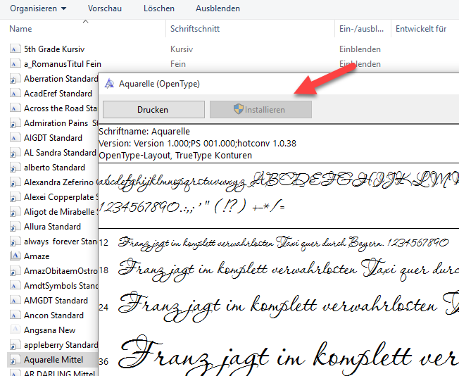 Re: Schriftarten ... wie den Überblick behalten ?Schau mal, ob die Schriftart auch installiert ist. Doppelklick darauf und gehe auf installieren, dann müßte es klappen