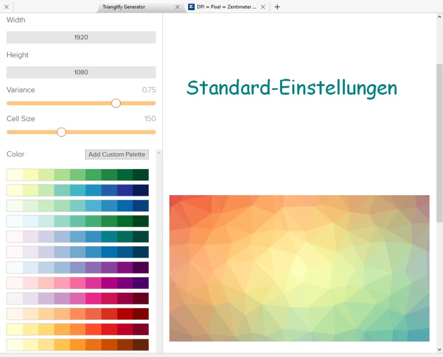 Trianglify Generator So können die Farb-/Verlaufsflächen aussehen: In der Grundeinstellung erhält man ein mehrfarbiges Muster aus diversen Formen (nicht nur Triangle Die Größe der Farbfläche kann individuell eingegeben werden. Die für das Fotobuch benötigte Fläche kann man sich errechnen - oder im Netz errechnen lassen. Der Fotobuch-Anwendung reicht eine Auflösung von 150 dpi, um noch einen grünen Smiley anzuzeigen. Das ergibt für die Farbfläche folgende Größen: