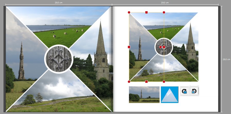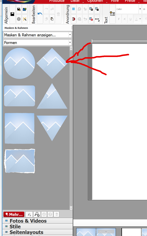 Das rechte und linke Bild musst du drehen: Das linke Bild bekommt die Maske mit der Spitze nach oben. Dann drehst du es zuerst mit "Objekte rechts drehen" (Bereich Anordnung), dann drehst du den Bildinhalt mit "Foto links drehen" (Bereich Foto). Das rechte muss dann entgegengesetzt gedreht werden.