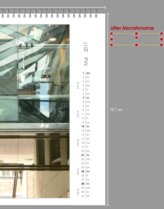 ich wünsche mir schon lange Kalendarien, die ich mit den normalen Textwerkzeugen formatieren kann. Es hat sich schon einiges getan, aber manches lässt sich leider noch nicht individuell ändern. Da muss man dann wieder tricksen Ich werfe z.B. regelmäßig die Monatsnamen aus dem Kalender, indem ich sie vom Kalenderblatt weg auf den grauen Hintergrundbereich ziehe. Dann füge ich auf dem ersten Kalenderblatt ein normales Textfeld ein, schreibe den Monatsnamen und ggf. das Jahr hinein, und formatiere und positioniere es nach meinen Vorstellungen. Dieses neue Textfeld kopiere ich dann und füge es auf allen Blättern ein. Es wird dabei immer an die gleiche Stelle gesetzt. Dann gehe ich wieder Blatt für Blatt durch und ändere den Monatsnamen. Ich markiere den Monatsnamen mit Doppelklick und schreibe den neuen. Mit dieser Vorgehensweise komme ich total gut zurecht und es geht flott (auch wenn es mit einer erweiterten Formatierungsmöglichkeit des Monatsfeldes einfacher wäre). Man ist dann natürlich selbst dafür verantwortlich, dass man den richtigen Monatsnamen auf das passende Kalenderblatt schreibt, vor allem, wenn der Kalender nicht mit dem Januar beginnt Allerdings bastele ich meist noch ein paar zusätzliche Elemente mit ein, um z.B. eine Linie hinzuzufügen oder unerwünschte Kalendariumsbereiche zu verdecken. Das mache ich zunächst auf dem ersten Blatt und kopiere dann alles zusammen mit dem Monatsnamen von Blatt zu Blatt. liebe Grüße