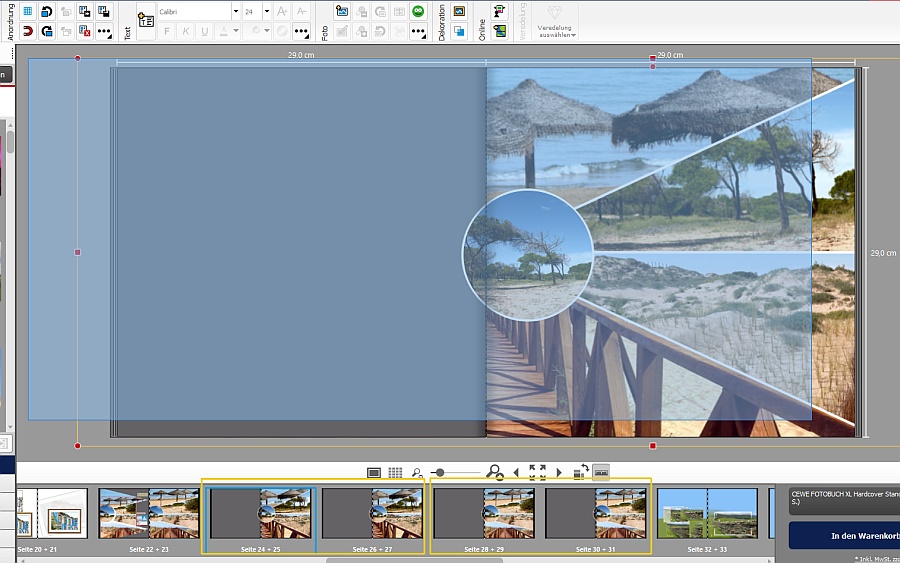 Weil das so ist, habe ich für mich entschieden, die gerade gewünschte Gestaltung auf der letzten Doppelseite vorzunehmen. Zum Einen, weil ich da Platz habe, um Fotos ggf. auf die jeweils andere, leere Seite zu schieben, zum Anderen, weil ich so der Gefahr entgehe, irgendetwas anderes (andere Seiten, etc.) versehentlich zu verändern. Das passt soweit auch. Nun aber kommt die Frage, eigentlich sind es zwei: