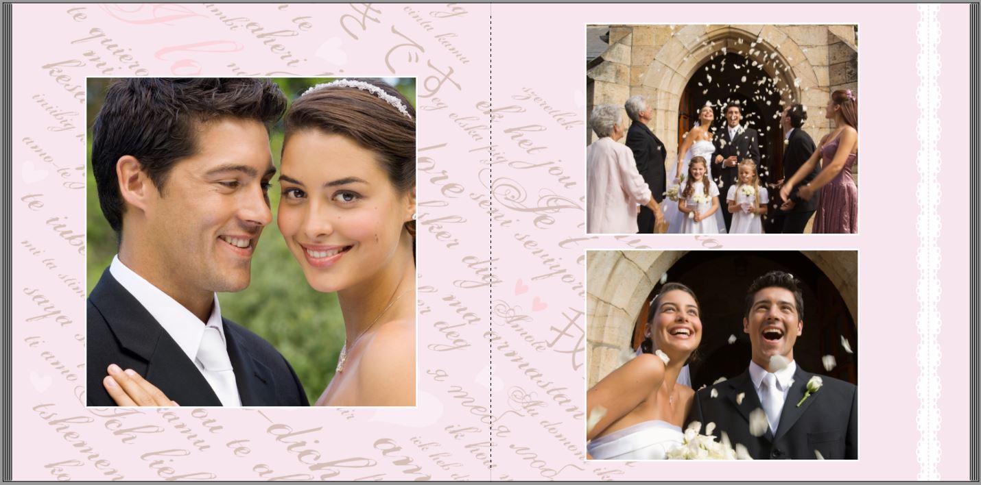 Zuerst habe ich einen dezenten rosafarbenen Hintergrund ausgewählt. Auf alle Bilder habe ich einen weißen Rahmen mit 1mm Breite gelegt. Ich habe mich für diese Seite für ein Clipart aus der Kategorie "Liebe" entschieden - das Herz mit "Ich liebe dich"-Schriftzügen in verschiedenen Sprachen. Dieses habe ich gedreht und dann sehr großflächig über die Doppelseite gezogen, sodass die Schriftzüge noch recht gut erkennbar sind aber trotzdem den Hintergrund ausfüllen. Mir war hierbei wichtig, dass die eigentliche Herzform immer noch gut erkennbar ist. Anschließend habe ich die Transparenz des Cliparts auf 70% eingestellt, um die Intensität etwas zu verringern.