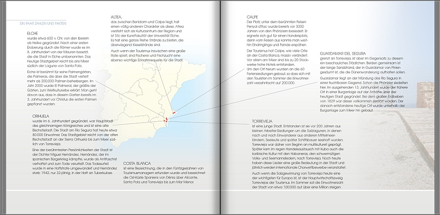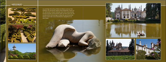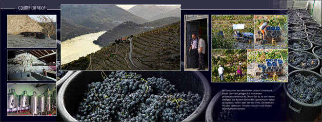 Für deine 2. Seite sehe ich das ähnlich. Der Wein als Hintergund ist eigentlich ein schönes Motiv, aber er ist auch der Eycatcher und stiehlt dem Landschaftsfoto die Show. Ich würde es auch mit Transparenz versehen. Das Foto rechts mit den beiden Männern wirkt etwas verloren an dieser Stelle. Wie wäre es, wenn du es gegen die Weinkübel ganz rechts austauschst. Dann würde auch der Verlauf, den man jetzt kaum sieht, besser zur Geltung kommen. Von den 4 kleinen Fotos, die zusammen das Rechteck bilden, würde ich auch 2 weglassen, dafür das ausgetauschte Weinkübelbild verkleinern und in das 4er-Ensemble einfügen als Hochformat. Alle etwas nach links Richtung Landschaftsbild rücken. Insgesamt würde ich das Dunkelblau des Hintergrundes vielleicht sogar gegen einen helleren Farbton austauschen, müßte man probieren! Deine 3. Seite wirkt gut, der Hintergrund ist zwar kräftig, aber nicht unruhig und nimmt den Fotos nicht die Wirkung. Auch hast du auf dieser Seite auf die kleinen Formate verzichtet. Leidiglich die beiden Fotos unten rechts würde ich auf gleiche Größe bringen.