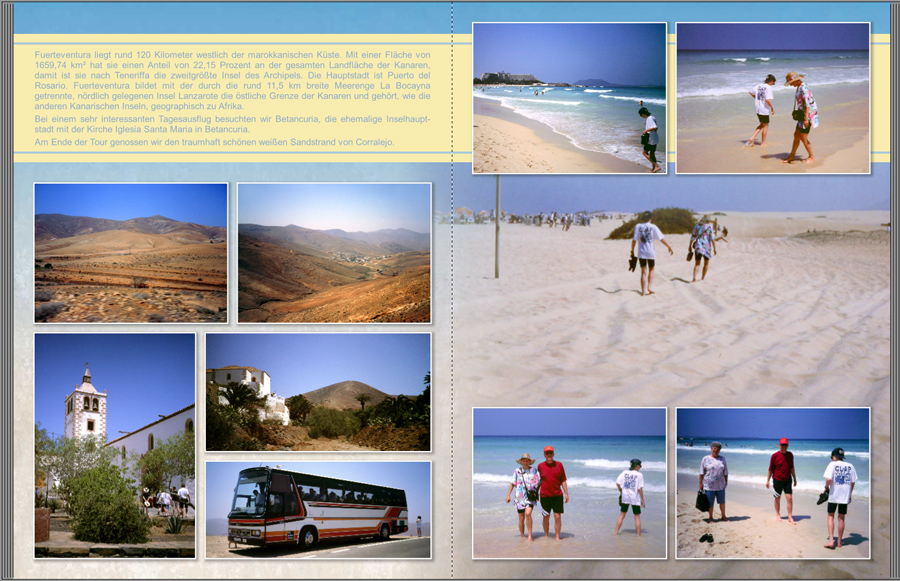 Hier zeige ich drei Doppelseiten aus einem recht farbig gehaltenen Buch von mir. Beim Thema "Lanzarote 1995" (mit einem Ausflug nach Fuerteventura) hat mir spontan der Cewe-Hintergrund dazu gefallen. Die Farbe der Schrift habe ich auch mit dem Farbpicker daraus entnommen und das Gelb der Farbstreifen fand ich passend. Fotos sind gescannte Dias mit teils mäßiger Qualität, darum wollte ich das Buch durch die freundliche Farbgebung des Hintergrunds noch ein wenig aufpeppen. Es ist - wie alles - reine Geschmackssache. Ist es harmonisch? Für mich ja. D:roll: