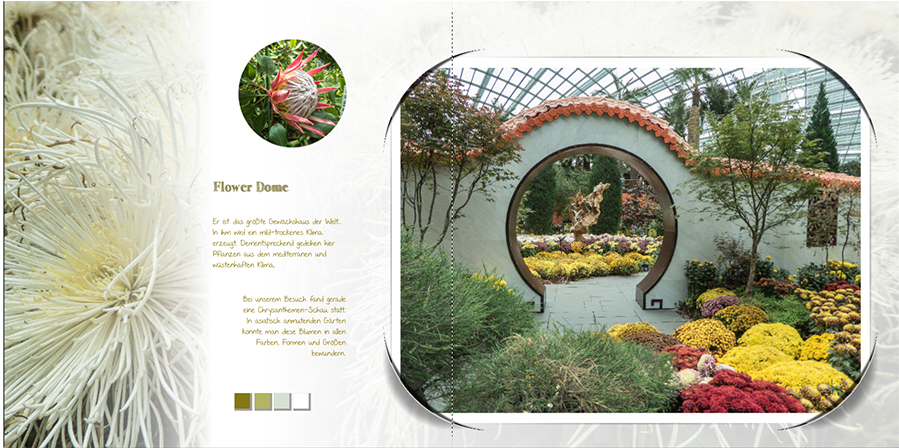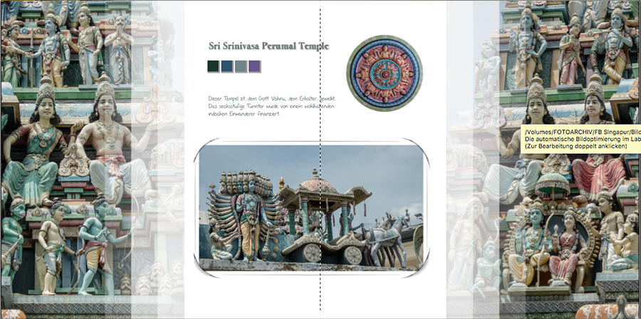 Singapur: dort habe ich zum Auftakt jeder neuen Sehenswürdigkeit farbige Quadrate gesetzt. Die Farben sind dem Motiv entnommen. Die Schrift habe ich ebenfalls bunt gestaltet.