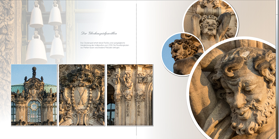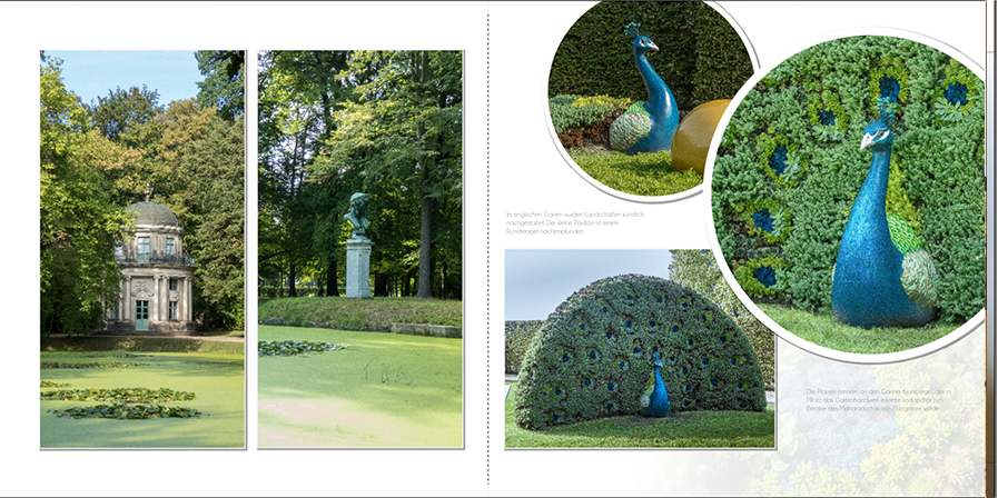 Das Buch wird sehr farbintensiv, wobei ich die Hintergrundfarben den Bildern entsprechend wähle. Dadurch hat jede Doppelseite eine andere Farbgebung. Ist das Buch in seiner Gesamtwirkung dadurch unharmonisch oder besteht die Harmonie in der Gemeinsamkeit der doch sehr kräftigen Farben? Daher noch 2 Seiten.