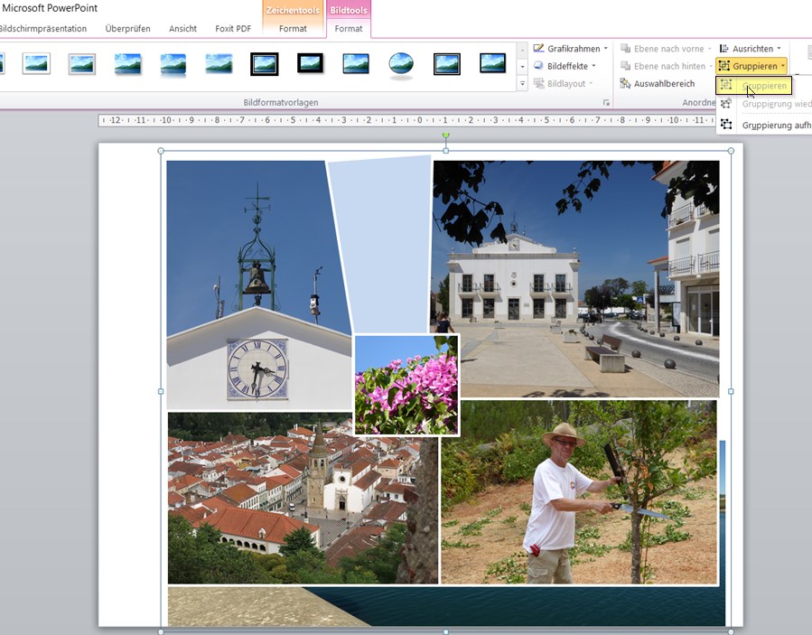 eine Möglichkeit wäre, dir in PowerPoint eine "Collage" zu erstellen, diese ins Fotobuch einzufügen und darauf die Maske anzuwenden. Was die Formen betrifft, bist du dann aber eingeschränkt, das Ergebnis würde eher an Rotumas Beispiel als an dein verlinktes herankommen. Du fügst dafür die gewünschten Fotos auf eine PowerPoint-Folie ein und arrangierst sie. Dabei nutzt du die ganze Folie. Dann markierst du alle Elemente und gruppierst sie. Das zeitaufwändigste dürfte das passende Arrangement sein, so dass die Fotos in der Maske gut rüberkommen. Da braucht es vielleicht mehrere Versuche. Du kopierst die Gruppierung dann mit Strg+C, wechselst zum Fotobuch und fügst sie mit Strg+V ein (aber das kennst du wahrscheinlich, wenn du öfter PP-Effekte für das Fotobuch nutzt.) Da PP nur bis 220 ppi auflöst, muss deine Collage im Fotobuch etwas kleiner bleiben als in PP, damit der Smiley noch grün ist. In meinem Beispiel war das, ausgehend von seitenfüllend in PP, eine Größe von 20,3x18,7 im 30x30 cm Fotobuch. Das müsste eigentlich reichen. liebe Grüße