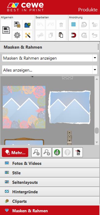 Angefangen habe ich mit einem Fotorahmen, den ich links in der CEWE FOTOBUCH Software unter "Masken und Rahmen" durch Klicken auf den "Mehr" Button gefunden habe.