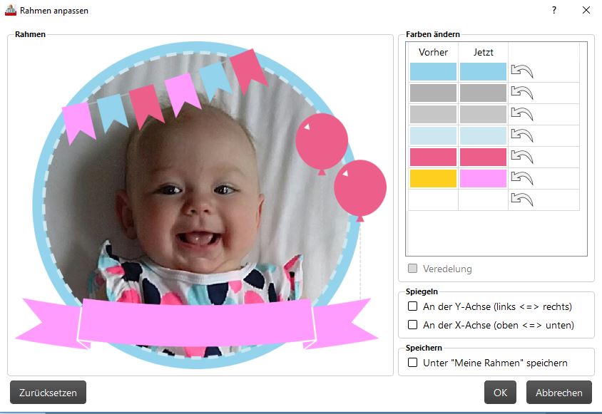 Nachdem ich den Rahmen auf der CEWE Fotobuch Seite platziert habe und mit dem Foto von Baby Lisa versehen habe, habe ich die Farbe des Banners unten in der Grafik von gelb zu pink geändert. Per Doppelklick auf den Rahmen öffnet sich ein Bearbeitungsfenster, in dem sich die Farben vieler Grafikelemente ändern lassen.