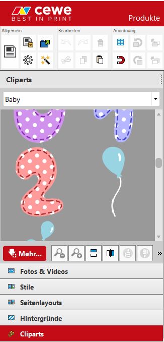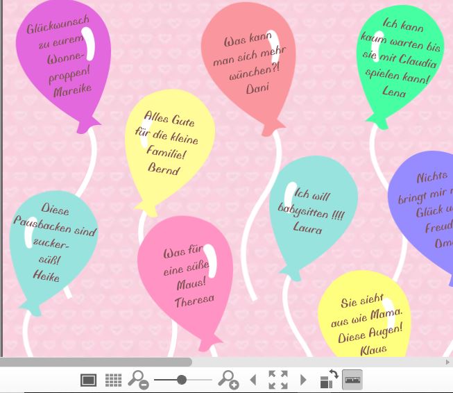 Die Ballons mit den Glückwünschen der Gäste stammen alle von einem blauen Ballon, den ich unter Cliparts im Babybereich links in der CEWE FOTOBUCH Software gefunden habe.