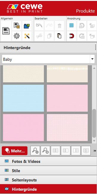 Letztlich habe ich als Seitenhintergrund eine texturierten pinken Hintergrund auf der linken Seite der CEWE FOTOBUCH Software im Babybereich ausgesucht.
