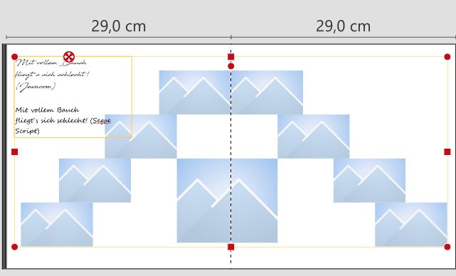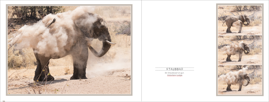 Mein Gedanke zu der Möwe war, dass sie zeigt, wie fliegen geht.... aber ich probier´ gleich mal wirklich etwas weniger und die Schrift will auch noch mal überdenken Findest du es schlimm, wenn ein Bild genau in der Mitte liegt - ist Lay-Flat? Ich müsste dann halt das letzte Bild rechts weg nehmen ….. Also dann, auf ein Neues Re: Schrift und PlatzierungSo gefällt es mir.