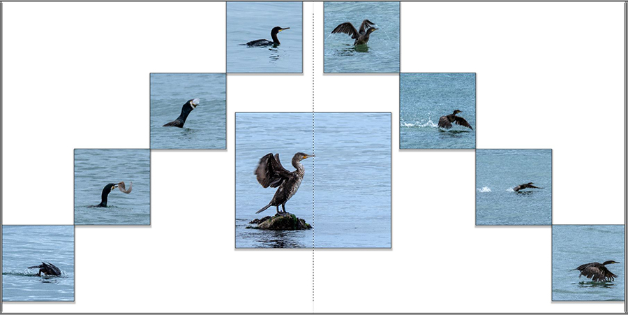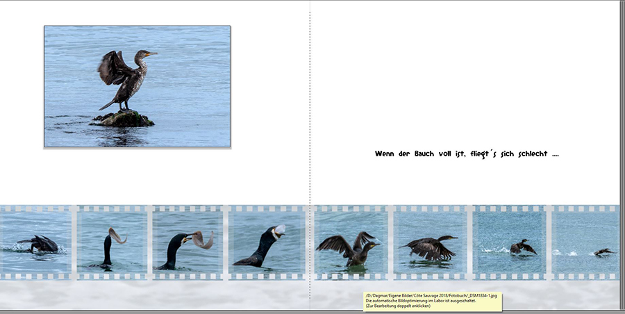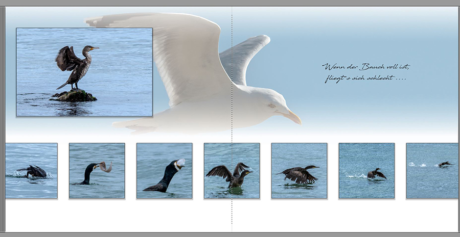 Re: Schrift und PlatzierungMir fällt auf, dass der Kormoran sich zuerst nach rechts bewegt und dann nach links. Kannst du die Bilder auf der zweiten Seite nicht einfach spiegeln? Dann hat es meiner Meinung nach ein logischere Folge.
