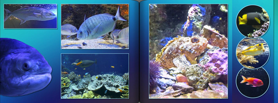 Ich habe hier eine Seite, die Bilder eines Aquariums zeigt. Im fertigen Buch ist der freigestellte Fisch ein Hingucker, der die Seite auflockert.