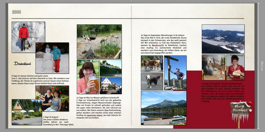 ich werde mir Deine Seiten sicher nochmals anschauen, aber ein paar erste Gedanken möchte ich schon einmal loswerden. Ist es für Dich so wichtig, wie lange Ihr jeweils an einem Ort wart, dass es unbedingt immer erwähnt sein soll? Vielleicht würde es einfacher sein, z.B. "Im September besuchten wir das erste Mal St. Johann in Tirol..." zu schreiben. In Erinnerung bleiben doch eher die Anekdoten als die Aufenthaltsdauer, oder? Ich verstehe, dass Du die jeweilige Reise mit einer kurzen Schlagzeile beginnen willst. So wie Du es jetzt geschrieben hast, ist es aber leider keine Überschrift, da kein Zeilenabstand zum übrigen Text besteht. Es sieht aus wie eine Satzzeile. Auch ist die Idee im Moment nicht konsequent umgesetzt. Bei Lischen im August gibt es z.B. keine weitere Schlagzeile. Und bei Heikos Geburtstag fehlt Dauer und Schlagzeile ebenfalls. Was ich im Screenshot immer nicht so gut einschätzen kann, ist die Schriftgröße. Im Verhältnis zur Seiten- und Bildgröße erscheint sie mir recht groß. Vielleicht würde 1-2pt kleiner dem Platzmangel schon entgegenwirken? Auf jeden Fall wird es ein schönes Geschenk für Deinen Mann! Liebe Grüße