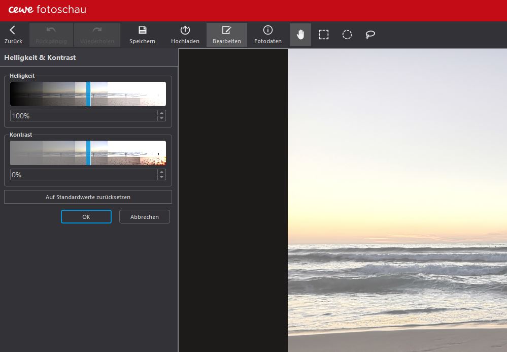 Als Hintergrund habe ich ein Bild verwendet, das ebenfalls ungefähr zur gleichen Zeit aufgenommen wurde, aber nur den Strand zeigt. Per Doppelklick habe ich in der CEWE FOTOSCHAU den Kontrast verringert und die Helligkeit erhöht, um einen verblichenen Effekt zu erzielen.