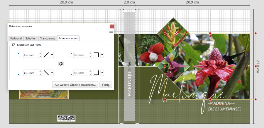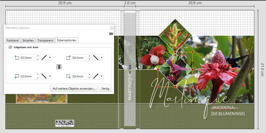 Ich hatte damals bei meinem Buch im Kommentar vom 10.2.2019 eine Erläuterung dazu abgegeben, wie ich vorgegangen war. https://www.cewe-community.com/global/e ... nsel-51591 Ich hab mit Eckenoptionen gearbeitet und mit dem Hilfsraster und Ausrichten an den anderen Objekten gearbeitet. So wars nicht so n Gefriemel. "Es handelt sich beinahe ausschliesslich um "normale" Fotorahmen. Ich habe - mit wenigen Ausnahmen - weder Fotorahmen gedreht, noch die Bilder im Fotorahmen gedreht. Stattdessen habe ich für die Rauten die Eckenoptionen intensiv genutzt. Teilweise war es hierfür erforderlich, Fotos massiv über den Seitenrand heraus zu ziehen um die geforderten Eckenlängen hinzukriegen. Fürs Ausrichten der Fotos habe ich das Hilfsraster (Linienabstand 4mm) und oft die intelligenten Hilfslinien verwendet." Zudem habe ich einem User dann per e-Mail noch wie folgt erläutert: Mit Bildern: