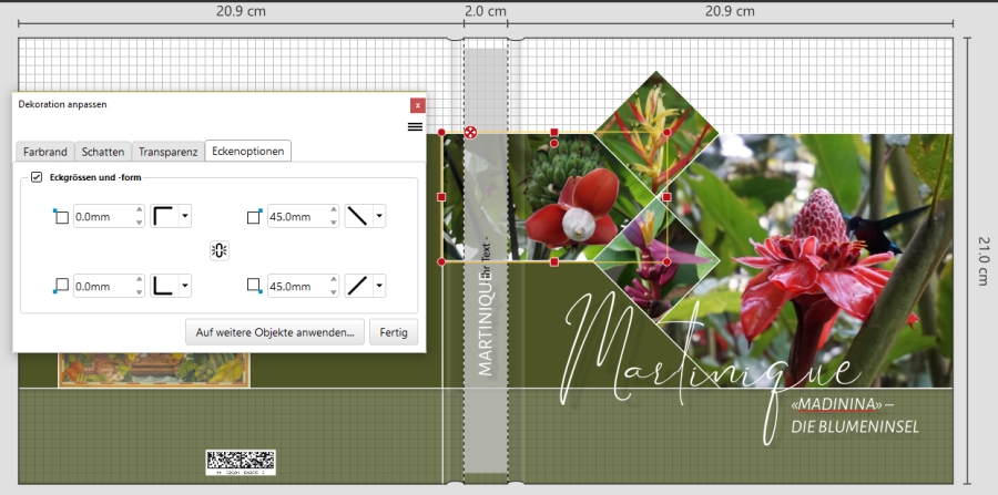 ich brauche wieder mal eure Hilfe! Könnt ihr mir sagen wie diese Titelseite gemacht wird? https://www.cewe-community.com/global/e ... pass-52097 Es ist mir schon klar, dass ich die Rautenformen verwenden muss, aber welcher Form ist das die nur 2 Kanten spitz zulaufen lässt, wie bei dem Foto vom Schiff? Mit den Eckenoptionen habe ich es schon versucht, aber da wird es nie ganz spitz! Danke Zaubermaus LG Zaubermaus