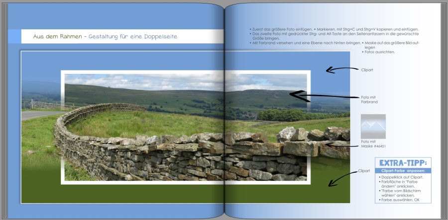 Eine genaue Anleitung für eine Gestaltung wie im genannten Fotobuch, nur mit breiterem Farbrand, findest du in einem meiner Anleitungshefte. Wenn du magst, kannst du es dir ansehen, es ist das "Arbeitsheft Seitengestaltung" in diesem