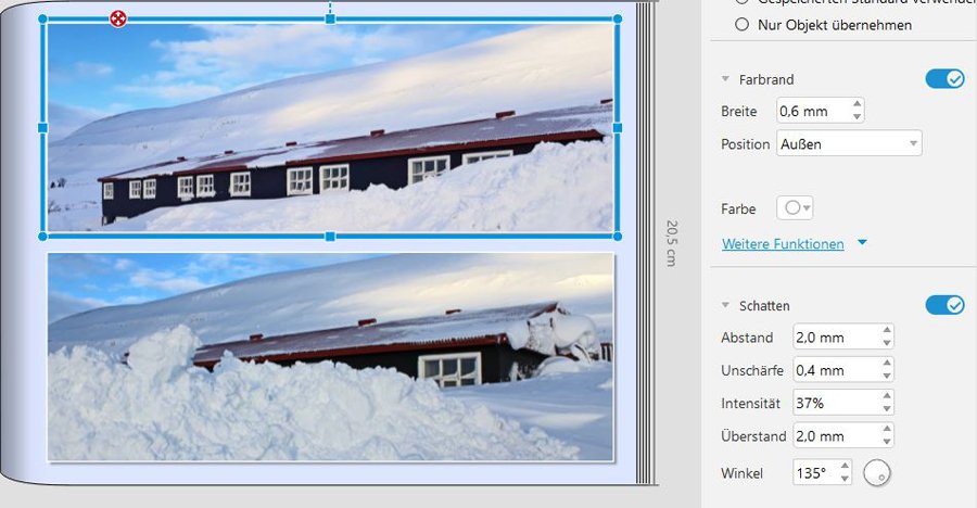 Danke schön fürs zeigenich verwende meist diese Maße: Maße.JPG Re: Rahmen & SchattenIch habe Deine Schatteneinstellungen bei mir einmal nachgestellt. M.E. wirken die Bilder damit so, als würden sie sehr weit von der Buchseite abstehen, fast als würden sie auf kleinen Klötzchen kleben. Auf mich wirkt das eher unnatürlich. Du hast ja schon verschiedene Vorschläge für andere Schattenwerte erhalten. Da geselle ich noch einen dazu. Bäuerin hat hier eine schöne dezente Möglichkeit aufgezeigt: